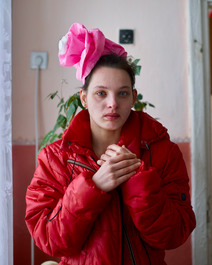UKRAINE. Ternopil. Petrykhiv. 2014. Luba, 20, dressed as a flower for the spring recital. Eighty girls live in near isolation in the Petrykhiv Children's building, a Soviet institution built in the 1960s to house girls with mental disabilities. Once a month they're permitted to leave the premises. They go shopping, eat pizza, and bowl.