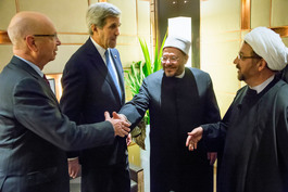 Klaus Schwab; US Secretary of State John Kerry; Egyptian Grand Mufti Shawki Ibrahim Abdel-Karim Allam; and Ahmad Iravani, Iranian Shiite leader in the US.. SWITZERLAND. Davos. World Economic Forum Annual Meeting. 2016