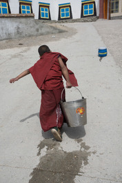 China. Gonghe County, near Ching Hai Lake (Blue Sea) . Buddhist Monastery La Mao Zhou. A young monk collects water. This work was carried out with the support of Prospect Foundation China. (Yuan Ji Shi) 2015.