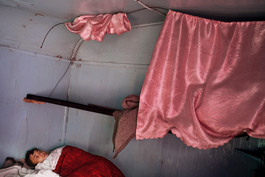 Kyrgyzstan. Tien Shen Mountains. Torugart Pass. 2007. A trucker wakes up in a hostel made from a train wagon at the Torugart border crossing, waiting several days for the arrival of a truck of Chinese products that he will drive across Kyrgyzstan.