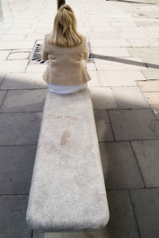 UK. London. Woman waiting on a stone bench. Oxford Street. 2015.