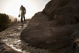 Tajikistan. Gorno-Badakhshan Autonomous Region. Garam Chashma. 2008. A journalist climbs to an overlook point at a mineral spring resort in the Pamir Mountains.