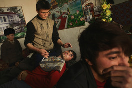 China. Xinjiang Uyghur Autonomous Region. Hotan. 2008. Uyghur men come for a shave and haircut at a Uyghur barbershop near the bazaar in Laika village.
