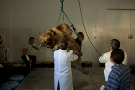TURKEY. Sarikamish. 2011. Scientists at the Kafkas University Veterinary Faculty Wildlife Treatment and Rehabiltation Centre lower a dead brown bear into a lab room where they will perform an autopsy and prepare the skin for a taxidermist.