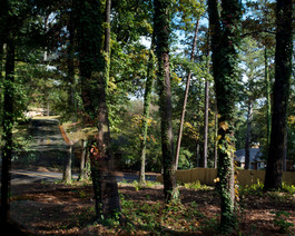 USA. Mountain Brook, Birmingham, Alabama. 2014. A view of a residential area along the Cherokee Bend 50 bus route seen through the bus window.