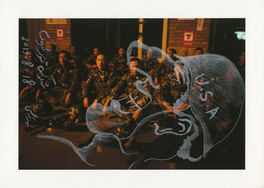 CHINA. Xinjiang. 2013. Chinese PLA soldiers with added US soldier. Photographer Carolyn Drake made prints of her own photographs and then asked her Uyghur subjects to draw their own pictures on top of them.