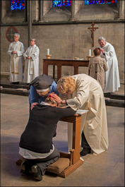 G.B. England. Wiltshire. Salisbury. Salisbury Cathedral. Blessing a member of the congregation at the end of a service in Magna Carta year. 2015