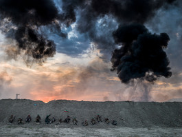 Iranian paramilitary Baseej forces reenact the Iran-Iraq War (1980-1988) in the south of Tehran.