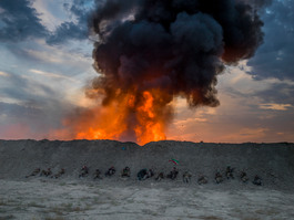 Iranian paramilitary Baseej forces reenact the Iran-Iraq War (1980-1988) in the south of Tehran.