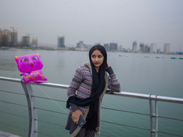 A young Iranian girl with her family visits an amusement park beside the new artificial lake Chitgar Lake dubbed Persian Gulf of Martyrs on Tehran’s west side.