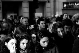 FRANCE. Paris. 2015. Aftermath of the terrorist attacks that hit Paris on Nov 13th 2015. People gather and mourn in front of the sushi restaurant that was attacked in Rue de Charonne.
