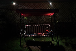 GREECE. Kos. September 12, 2015. Ali and Brahim, Syrian refugees, in the garden of a small hotel in Kos. They had arrived several days before by dinghy from Turkey after fleeing Syria with their parents and older sister. They intended to move overland to Sweden.