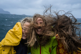 The photographer’s wife Anna visiting with two friends on a windy and wet day in Ålesund, Norway. 2013.