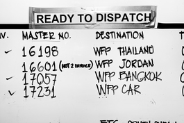 UAE. DUBAI. 2015. A chart tracks shipments at a warehouse operated by the World Food Programme at the International Humanitarian City, a distribution hub for a consortium of international relief agencies in Dubai, United Arab Emirates.