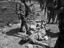SYRIA. Tel Hama. May 19, 2015. A Kurdish YPG fighter kicks the body of a dead Islamic State fighter killed during overnight coalition airstrikes on the front line near the village of Tel Hama, deep inside the Kurdish-controlled region of northern Syria that the Kurds refer as Rojava. YPG fighters arrived in the village of Tel Hama the morning after heavy coalition bombardment forced the retreat of Islamic State fighters who were in control of the village.