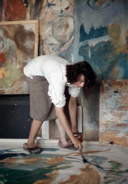 USA. New York City. 1957. Painter Helen FRANKENTHALER works on an abstract expressionist painting in her studio.
