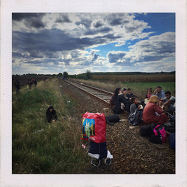 HUNGARY, Hungarian-Serbian border. Near Röszke/Szeged, 2015/09. Refugees, mostly from Syria and Afganistan walke unhindered through a gap in the hungarian border fence on a dysfunct railway line but are collected for processing by Hungarian authorities. Those who want to avoid processing climb over the fence and try to move North without being caught by Hungarian police.