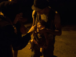 Syrian families walk at night toward the border to attempt to cross it. A woman gives medicinals to young children exhausted by days and weeks of walking.