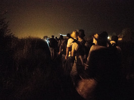 Syrian families walk at night toward the border are stopped by serbian border police.