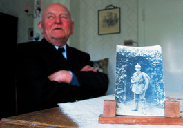 WEST GERMANY. 1976. A German veteran of the battle of Verdun poses with a photo of him taken during WWI.