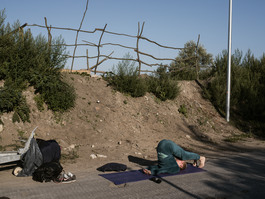 FRANCE. Calais. September 17, 2015. An activist pro-migrant does a Yoga cession at the entrance of the jungle as she wakes up in the morning.