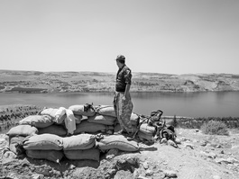 A Kurdish YPG fighter stands by a defensive position overlooking the Euphrates river near the village of Sarrin.