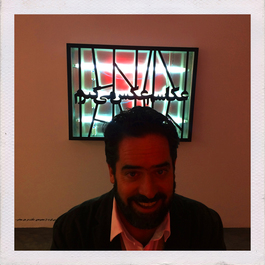 IRAN, Tehran, 12/2014. Thomas Dworzak photographed by his wife at Shirin Gallery in front of neon installation by Iman Safei “I am a photographer and I take pictures” in Farsi/Persian. (Picture by Sahar Dowlatshahi.)