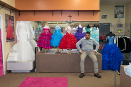 USA. Aurora, Illinois. 2015. Laith Alobaidi, an Iraqi refugee and the fiancé of Sham Al Hajali, in a dress shop in Aurora. They are preparing for their engagement party. The Al Hajali's are part of the small wave of 2,200 Syrian Refugees of the civil war who have been granted asylum in the United States. Their son, Wasseem, was initially granted asylum but his application has been put on indefinite hold. Father Mahmud, daughter Sham and twin 17-year old sons Ahmad and Mohamed work long hours at minimum wage to make ends meet.