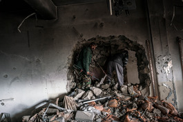 IRAQ. Sinjar. November 18, 2015. Kurdish fighters inspect an the entrance to a tunnel dug by Islamic State fighters near the northern entrance to Sinjar.