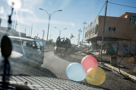 IRAQ. Sinjar. November 18, 2015. A pick-up truck carrying Yezidi fighters from the YBS (Shingal Defense Units) drives through the rubble-strewn streets of Sinjar days after re-taking the city from the Islamic State during an offensive led by Kurdish forces and backed by American airstrikes.