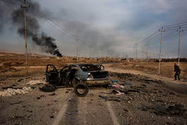 IRAQ. Sinjar. November 15, 2015. The wreckage of a car remains along Highway 47 at the western entrance to Sinjar as smoke from burning houses can be seen in the distance, days after Kurdish forces re-took the city from the Islamic State.