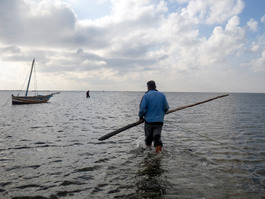 TUNISIA. Kerkenah Islands. November, 2015. Fathi Hadhri and his friend Laaroussi Hnana practicing the traditional “charfia” fishing method.
