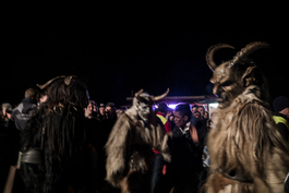 GERMANY, Bavaria, 2015/12 Freilassing - AUSTRIA, Sienzenheim. Bavarian-Austrian border. Perchten Lauf, Krampus Lauf. In Alpine tradition these devils accompagny St. Nicholas. In early December in many cities and villages local youth dress up as “Krampus” and run through the village scaring and hitting people. This year, expecially in places close to areas where refugees cross, events were cancelled.