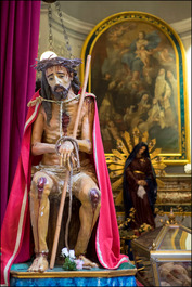 Europe. Italy. Sicily. Ragusa. Cattedrale di San Giorgio. This cathedral is situated at the top of the sloping Piazza Duomo, a baroque wonder built in the mid-18th century. The steps to the side of the cathedral figure occasionally in the Montalbano series on television. Close to an altar, the Madonna, and a glass casket containing holy remains, is this figure of a suffering Christ seated. 2018