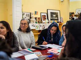 GREECE. Athens. 2018. Deborah Carlso Valencia, 69 during a poetry workshop with refugee women that partecipate in Melissa's program. Debbie is one of the cofounders along with 5 other women from diffrent nationalities. Melissa is a network for refugees & migrant women in Greece, promoting empowerment, communication and active citizenship.