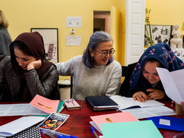 GREECE. Athens. 2018. Deborah Carlso Valencia, 69 during a poetry workshop with refugee women that partecipate in Melissa's program. Debbie is one of the cofounders along with 5 other women from diffrent nationalities. Melissa is a network for refugees & migrant women in Greece, promoting empowerment, communication and active citizenship.