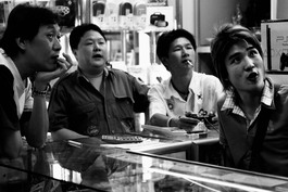 THAILAND. Bangkok. Klong Ong Ang market. Video game salesmen try out a new game. 2007