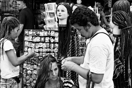 THAILAND. Bangkok. Tourist having her hair braided on Khao San Road, the center for back-packing foreigners. 2007
