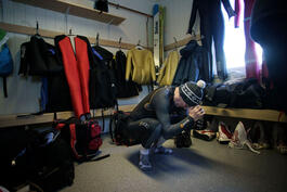 NORWAY. Tolga. 2019. Arnstein Vatle, b 1962, in the dressing room before the day’s jump at the Norwegian Championships for veteran ski jumpers. Vatle was nervous because he was jumping with two sprained rib bones.
