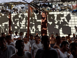 EL SALVADOR. San Francisco de Gotera, Morazan. 23 September, 2018. Incarcerated former gang members await the start of a church service standing in the yard of the San Francisco Gotera prison, under the shadows created from hanging laundry clothes. More than a thousand of the 1,300 prisoners in Gotera have renounced their gang ties and declared themselves born-again Christians.