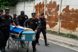 EL SALVADOR. Ciudad Arce. 19 September, 2018. Fellow policemen carry the coffin of Jose Antonio Alfaro Rodriguez, a 31-year-old policeman murdered by gang members while off-duty in front of his home in the Ciudad Arce district of San Salvador.