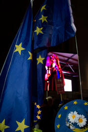 UK. 2019. London. Protestors outside the Houses of Parliament the day of the historic vote on Brexit. Labour MP David Lammy.