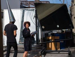 USA. Oakland, CA. 2018. Containertopia, a converted warehouse used as live work spaces made from shipping containers for artists and others seeking affordable rent. Wizard, in the hat, who works with light, prisms, mirrors, to create sculptural light shows for events like Burning Man.