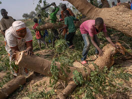 NIGER. Niamey. December 2017. An entire neighborhood of gardens along the Niger River was destroyed to make way for real estate speculators. The owners of the area were asked to recover the wood from the trees they themselves had destroyed.