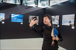China. Heilongjiang Province. Harbin. A young woman takes a selfie with Magnum photographer Jonas Bendiksen's images in the background. 2018