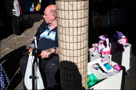UK. Wiltshire. Salisbury. A Christmas shopper on a mobility scooter looks at goods offered on a stall in the market. 2018