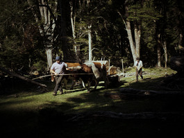 CHILE. 2019. Ernesto and Horaldo finally arrive at the small open side of the woods where the house is being built. They have been working for almost a year and the house should be delivered before the beginning of the winter time (June in the Southern hemisphere). Every single part of the house was brought with the oxes except for the wood that was taken from the surroundings forest.