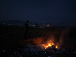 IRAQ. Dohuk. 2019. A man standing in front of a fire next to the refuge camp outside of Dohuk.