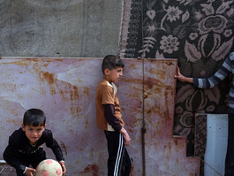 IRAQ. Serdashti Camp, Mount Sinjar. March 5, 2018. 8-year-old Khalaf (center) a Yezidi boy suffering from polio, lives with his family in the Serdashti camp for displaced Yezidis in Mount Sinjar. The camp lacks access to water, electricity, and medical attention.