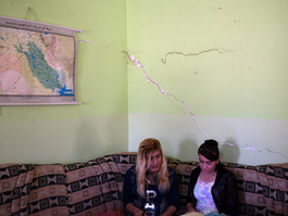IRAQ. Sinjar. March 4, 2017. Volunteer teachers sit in the school...